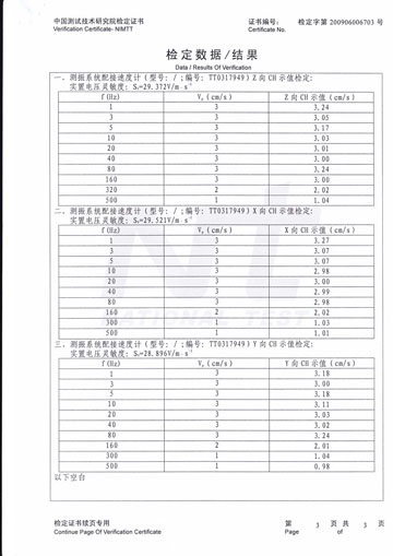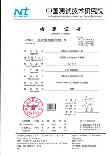 2009年6月,中科測(cè)控公司將多臺(tái)TC—4850爆破測(cè)振儀送交中國(guó)測(cè)試技術(shù)研究院進(jìn)行全方位的技術(shù)檢定并于6月18日獲得合格證書。